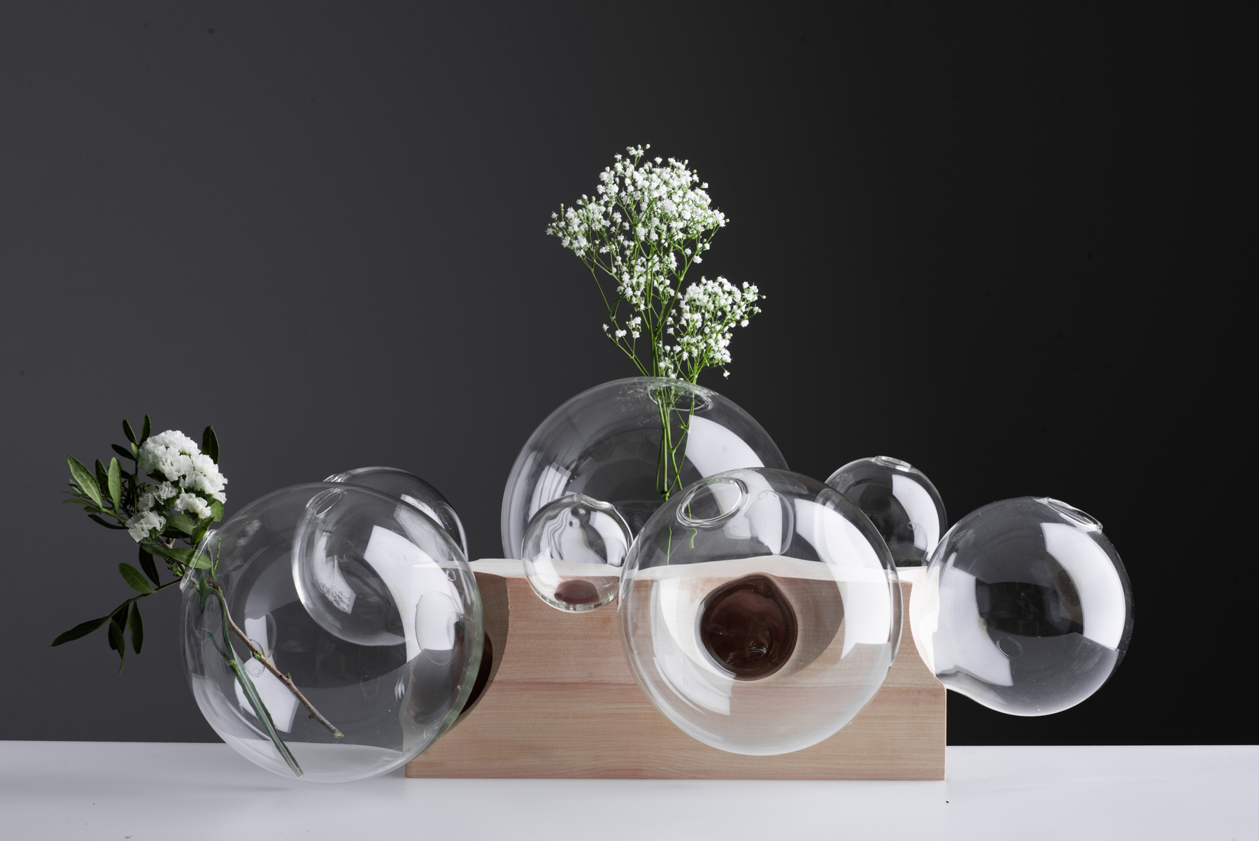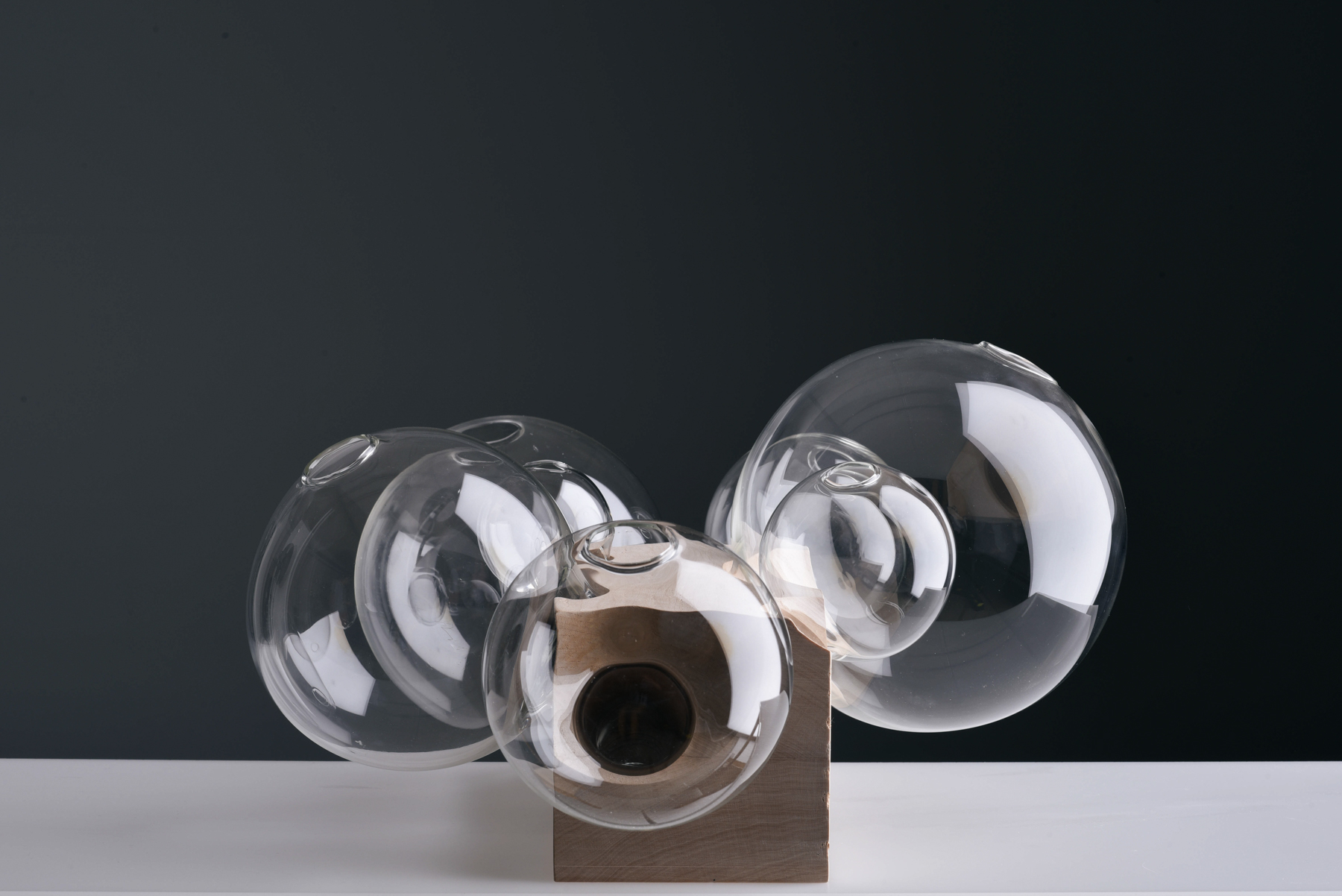 Septem Secreta results from a research on the topic of family and family secrets. As secrets are often kept in order to uphold a good name and façade, the members of this family of vases share a secret in order to appear flawlessly round to the outside. An odd deformation on their spheric bodies enables them to sit in the wooden base. Once taken out of the family base, this deformation stables them, preventing them from tilting. A seemingly unaesthetic weakness thus becomes the shared essential foundament of all family members.
